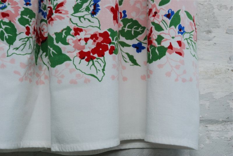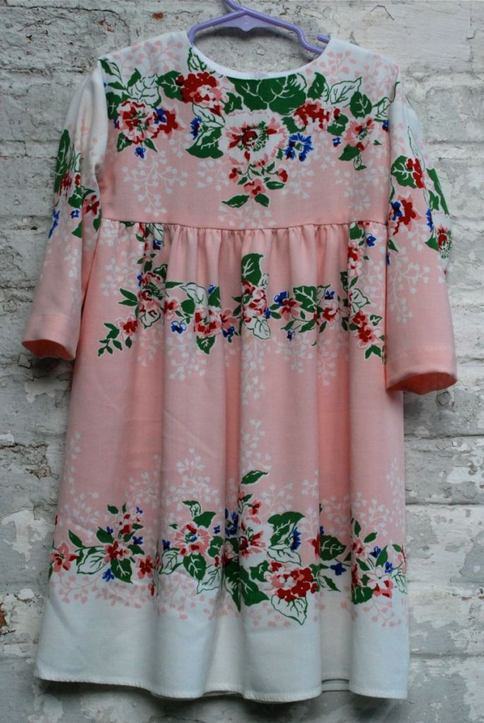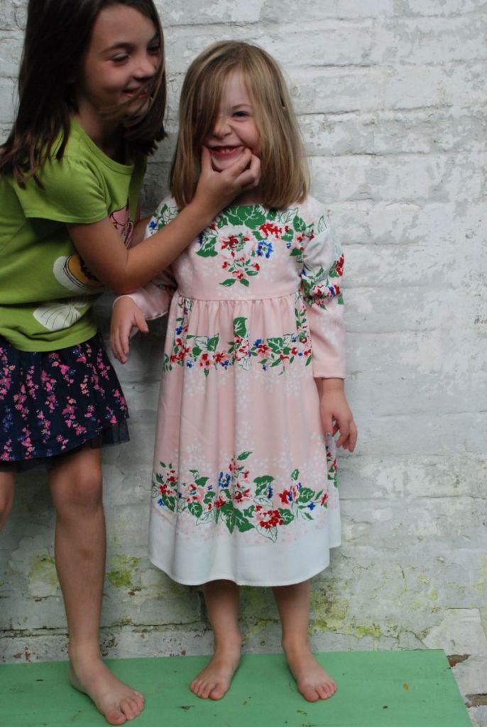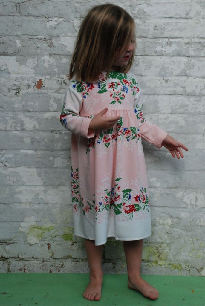 I’m in a crafty and sewing mood. I cleaned my sewing room (things were practically piled to the ceiling) and I was reminded of the huge list of things I want to sew. I get a panicky feeling when I think about how my days of sewing sweet little dresses won’t last forever. I came across this old stained tablecloth that I’ve had in my stash for a long time. I decided I’d better make a dress out of it now because a) a 12 year old probably won’t be into wearing tablecloths and b) even if they were there isn’t enough tablecloth to make a 12 year old sized dress. I had to do it NOW! Forget the laundry, forget the dishes, I must make this dress!!!