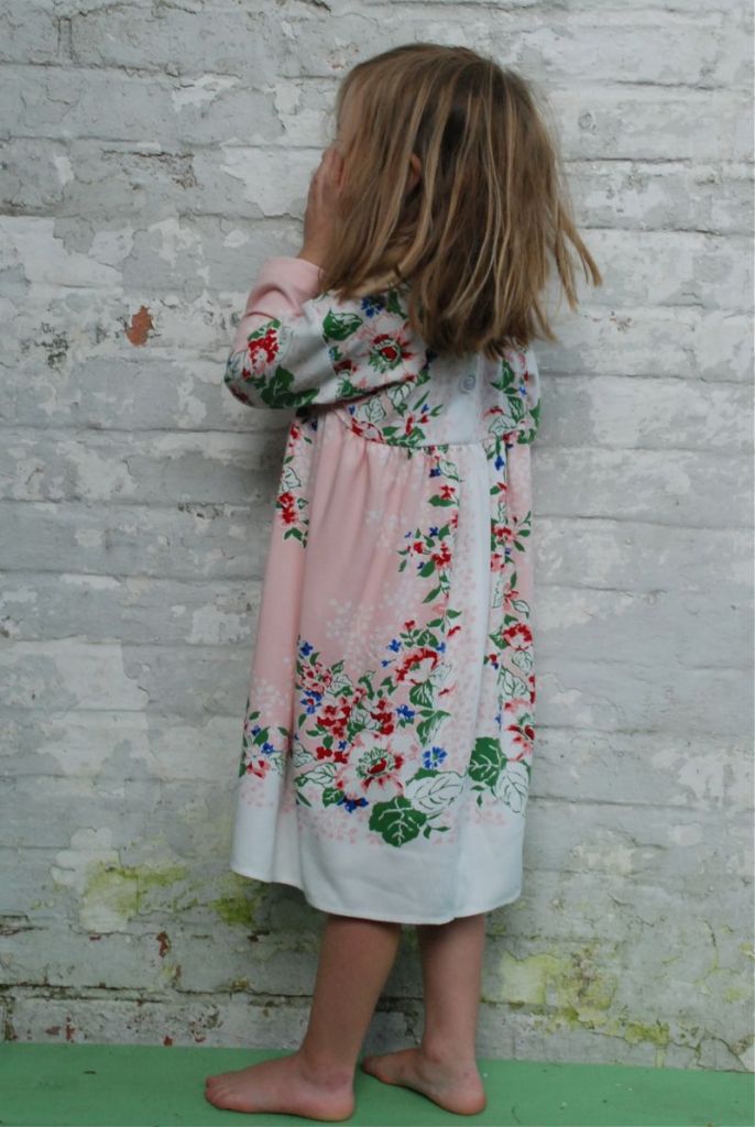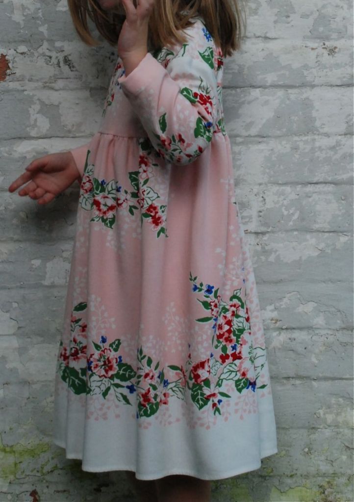 Here’s the dress. I used the Oliver + S. Playtime Tunic pattern, it’s such a good basic pattern. The tablecloth fabric is really nice – it feels heavy and light at the same time. I don’t know what you call it, but I like it. I used the hem of the table cloth for the bottom of the dress.