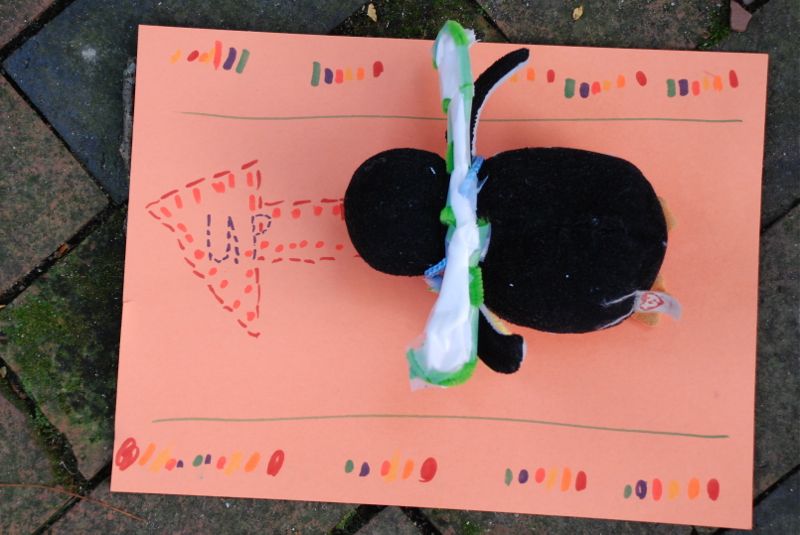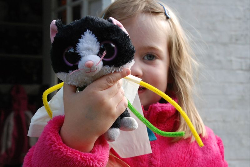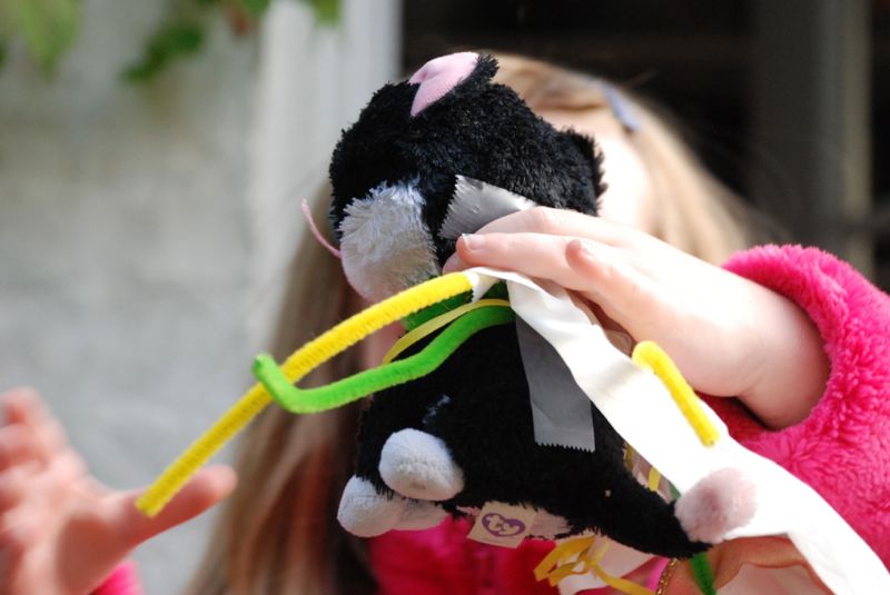 • I struggle. I struggle between liking that my girls are creative and can gather stuff from around the house and make their own playthings and artwork. And then I get annoyed because ther are piles of pipe cleaner and paper clips and kleenex with sparkley things taped on and acorns in little yogurt containers, and bits of paper cut and colored and taped onto stuffed animals. Uhg. What’s a mommy to do? Here they are proudly showing off their creations: