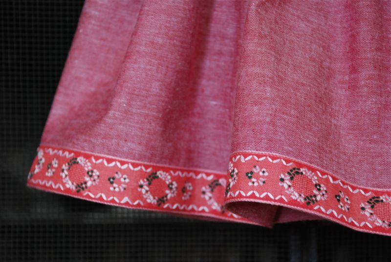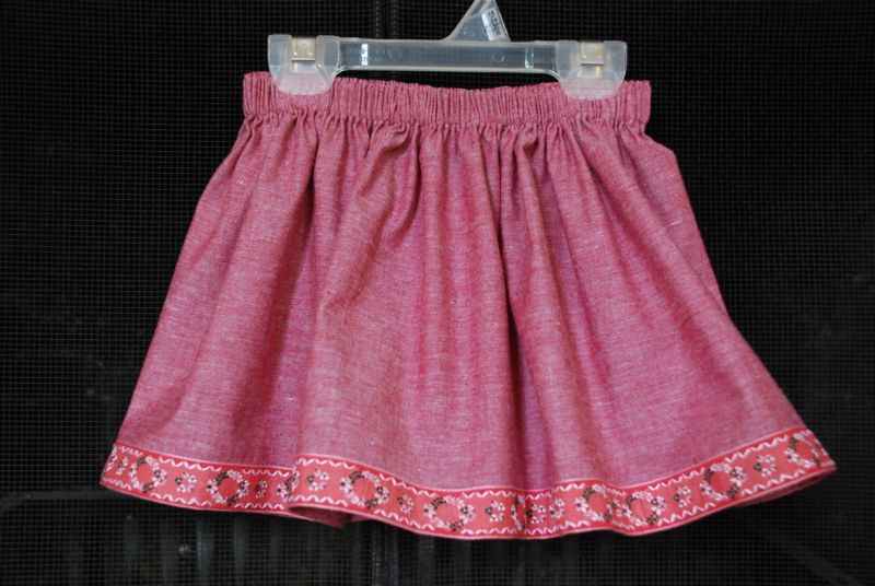 When Brian and I went to New York I bought some pretty ribbon to make a skirt for Claire. Claire prefers wearing skirts and dresses right now. She’s been wearing a couple little skirts that I made for Bea a reallly long time ago and they are finally getting a little snug and too short for her. I used the Lazy Days Skirt pattern which is free on the Oliver and S. web site. The special thing about this simple skirt pattern is the ribbon hem – the raw edge gets cleverly encased in the ribbon. The fabric is the same as one of Claire’s favorite dresses so hopefully she will like and wear this skirt.