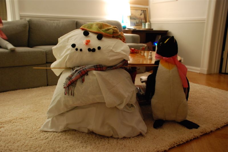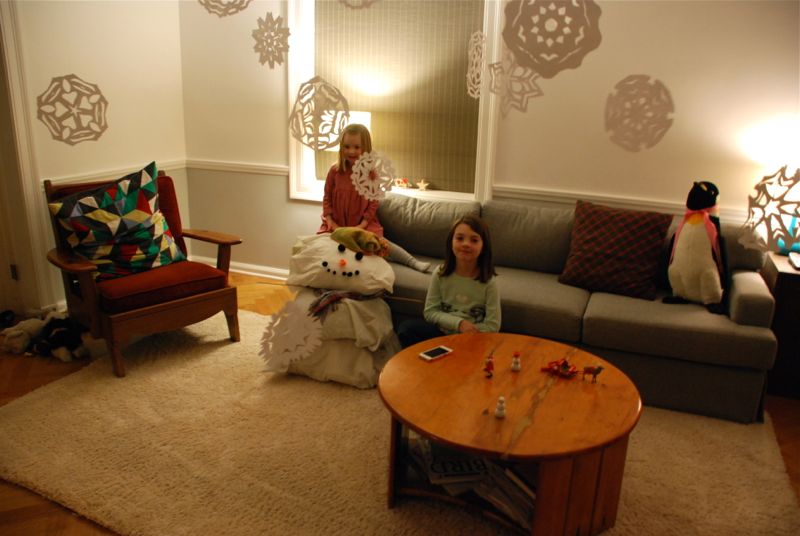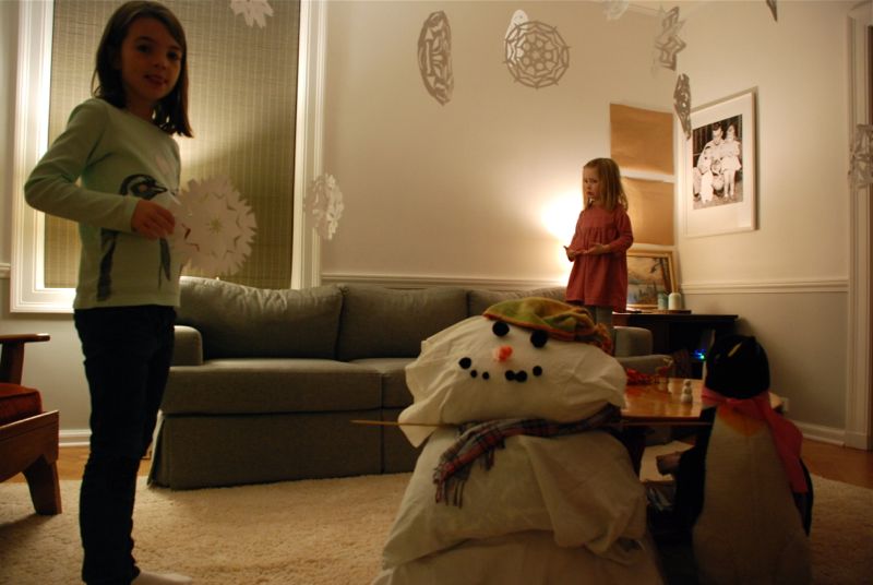 If we can’t have snow outside we’ll make our own inside. Bea created the snowman and we each snipped some paper snowflakes.