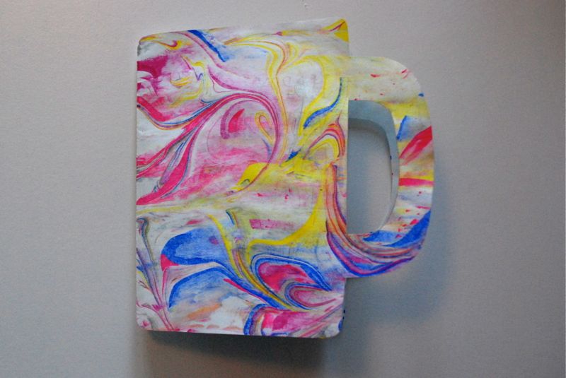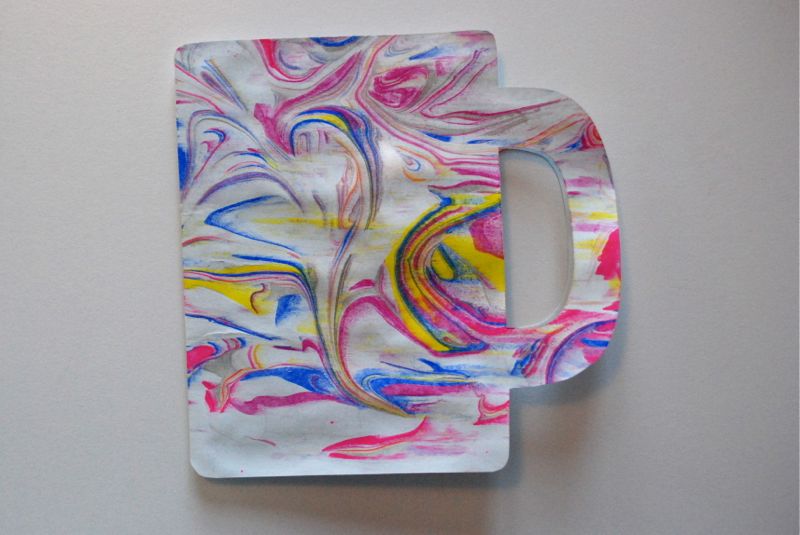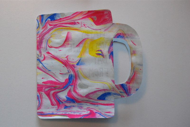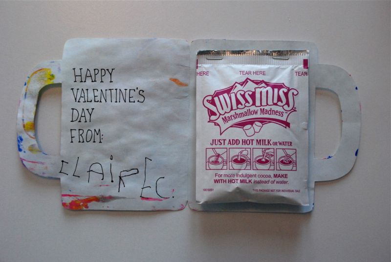 This week we made Valentines for the girls to take to their school parties. I prefer non-candy and non-food gifts for school parties, but Claire got all excited about this Swiss Miss hot chocolate with colored marshmallows. So we came up with an idea to fit a pack of hot chocolate in each valentine. I made a mug shaped card and then we tried this cool method for marbling. You use shaving cream and drizzle paint on top and after you press the paper onto the paint the shaving cream comes off easily with a squeegee. I was so impressed with our results. Claire loved swirling the paint around.