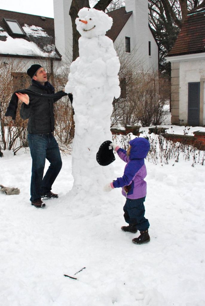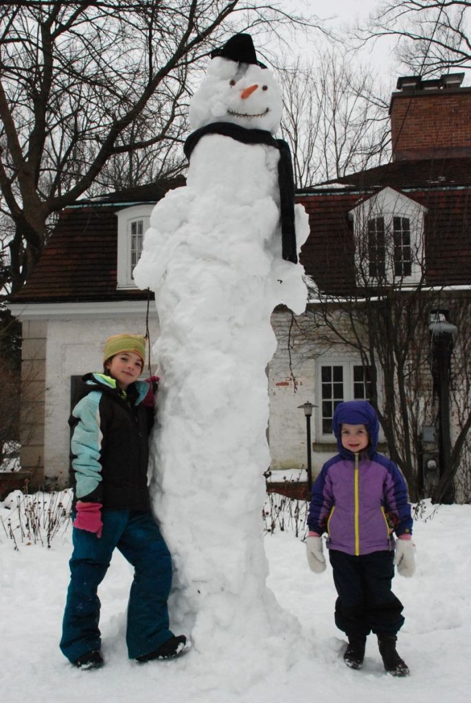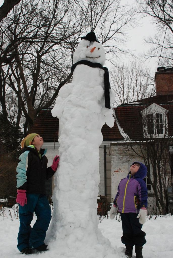 On Sunday the temperature was around 37 degrees. We had a whole yard of perfectly sticky snow – just right for making a snowman. Of course Brian had to take it to the next level – literally – by building it about 8 feet tall.