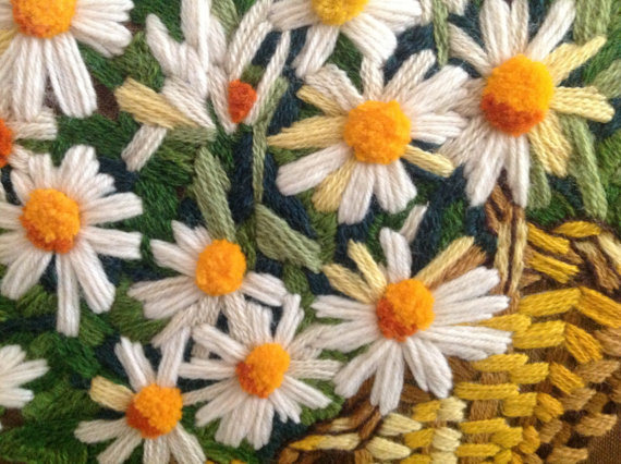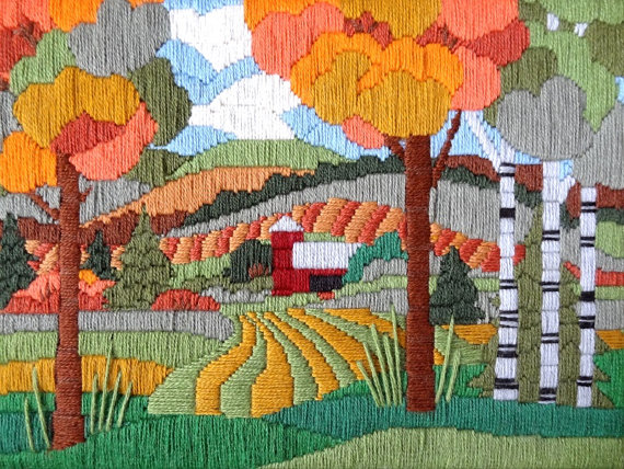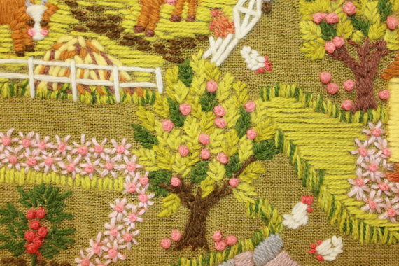 • When Brian is traveling I can’t go to sleep. I usually don’t do anything useful – I watch TV or read blogs. Or I look at Etsy and obsess over objects that I really don’t need. Things like Crewelwork – I have a couple that were done by Brian’s grandmas and handed down to me. And I have my eye on one at my mom-in-law’s house (signed Donna).
