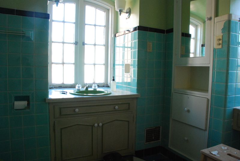 And here’s my other project that I haven’t mentioned lately – our master bathroom. I’m taking paint off the tile just like I did in the girls’ bathroom. I really like the pretty blue color that I’m revealing. It will look lovely with white walls and probably a black floor. I’m choosing the floor tile, a new (white) toilet and working out all the details with my contractor. It’s definitely in the ugly stage right now – can’t wait ’til it’s done.