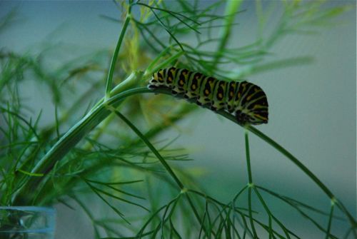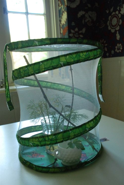 A while back I trimmed back my dill – I brought the trimmings in and put them in a glass of water. A couple days later a tiny caterpillar appeared. We put him in our bug holder and he’s been growing fatter everyday. I think it’s going to be a tiger swallowtail.