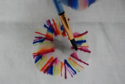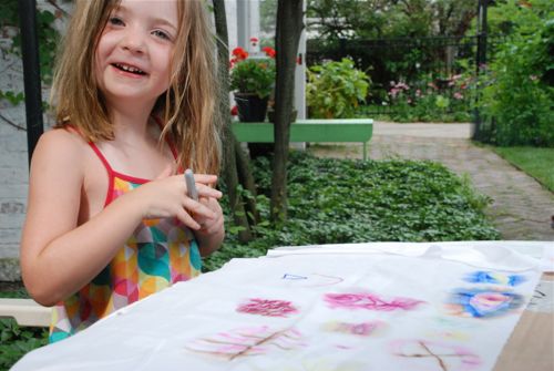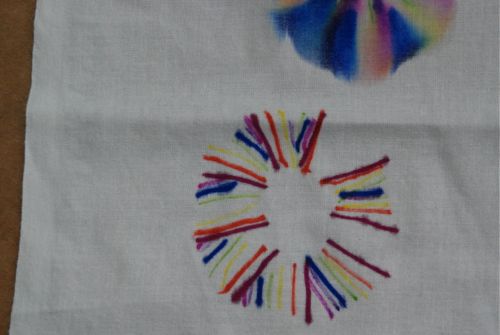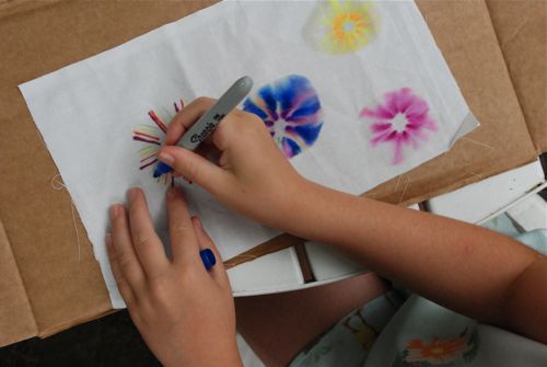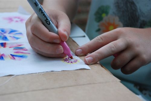 I have lots of crafts pinned – this one turned out great. It’s like easy tie dye. We colored on cotton fabric with our sharpies and then dripped rubbing alcohol to make the colors run.