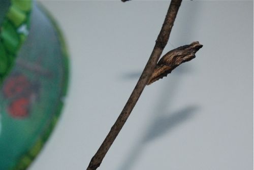 And – here’s an update on our caterpillar. He’s now a chrysalis. Before he made himself into a chrysalis he was super fat and active. Then he just hunkered down and turned from bright green to brown in a matter of hours. He’s sort of boring at the moment and so we are hoping to see wings any day.