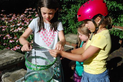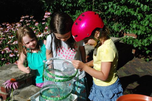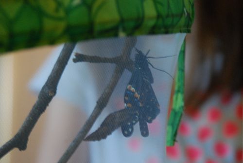 I couldn’t get a very good picture, but our butterfly emerged and we let him go in the backyard. Unfortunately we didn’t get to watch him coming out of his chrysalis. We totally missed it – he was sitting still getting some strength into his limp wings when we noticed him.