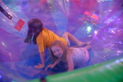 For the first ten seconds Claire was all smiles and then there was a drastic change and she was in complete terror. She was crying and looking panicked and Brian and I were watching helplessly. Poor Bea was so excited to go in a bubble and she couldn’t get her sister to calm down. It was such a strange moment. We were the parents of that kid – the one who DID NOT like the ride. On one hand I was laughing a little because of the look of terror on her face. On the other hand I was in a panic to get the fair dude’s attention so he could drag their ball to the start and let her out. Finally they did get her out and I was so relieved that they let Bea have a turn on her own. I’ll never forget that roller coaster of emotions that we all experienced. There’s Bea having her bubble fun below: