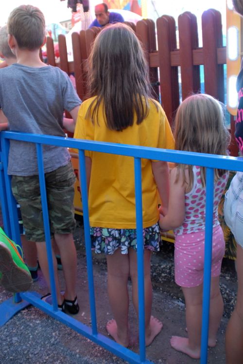 Everything was going great – the girls begged to go on two more rides – the swings and then these bubble things that were new. We knew we had to get up super early the next morning to catch our plane home, but we gave in because we were having so much fun. First we went on the swings and then the girls got in line to go in a bubble together. I love to see them holding hands.