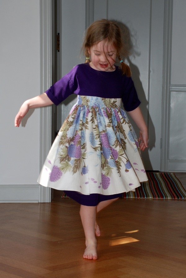 I used the very basic and easy Playtime dress pattern from Oliver + S. to go under the apron. I shortened the sleeves of the pattern to make it more springy. The apron was just the right length so all I did was sew it along the top to attach it to the dress. Simple. And I used the automatic button hole maker on my new sewing machine for the first time. The button holes look so much neater that the old ones I’ve made!