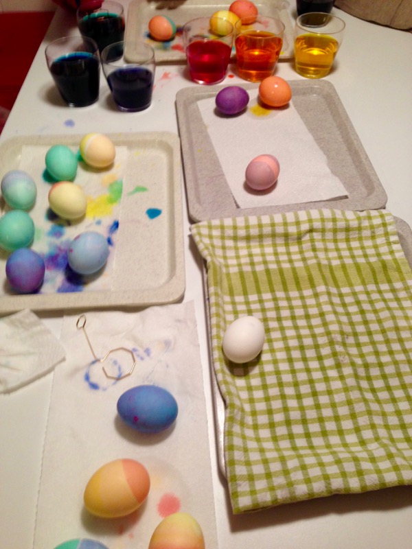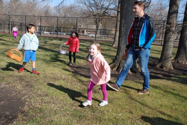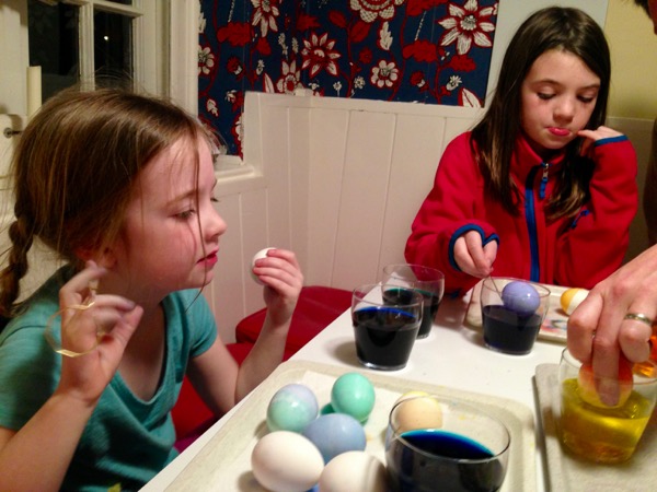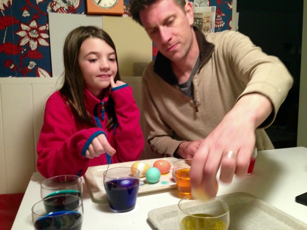 We colored eggs on Saturday and also went to our neighborhood egg hunt. Bea was at a friend’s house but Claire ran and gathered some eggs. It’s nice – she sees lots of her friends and our neighbors. Plus, I like to see Brian running around with a little basket in his hand.