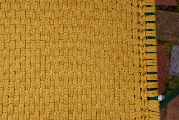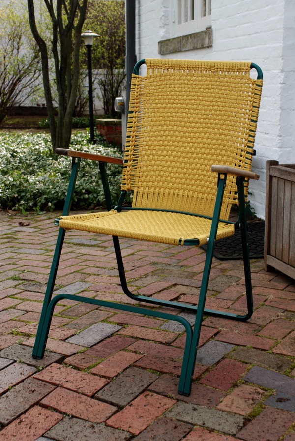 My lawn chair was falling apart. I was in danger of falling through the disintegrating plastic straps. So I thought of my Grandpa Dice. Yes, Grandpa Dice used to refashion lawn chairs with macrame so I thought I would give it a try. I found directions on line (yay internet). It wasn’t hard but it was a little back breaking and the plastic yarn felt yucky on my fingers.