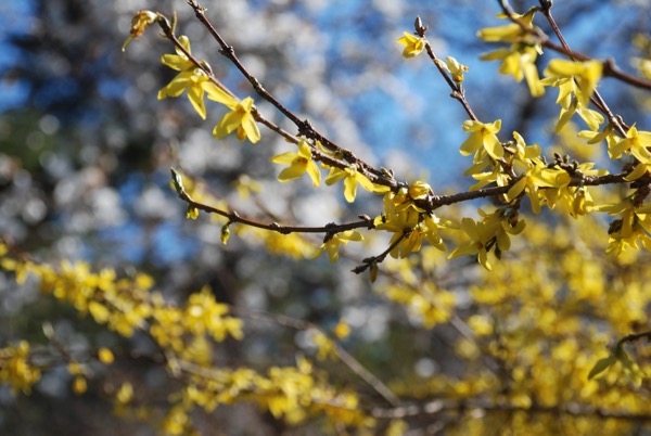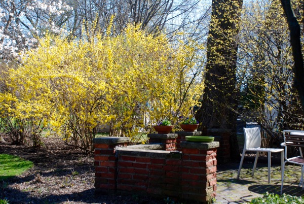 This weekend I sat in the sun and read a book. The light was striped with branch shadows. The birds sung all around me – sounding so happy, so clear, so bright. I kept getting interrupted by the bird sounds. I wish I knew which birds made which sounds. I looked into the branches searching for the birds that I could hear so clearly – but it was hard to put my eyes on the one I heard. What a different world they live in – such a different 3-D space in the branches. I saw a butterfly on my pachysandra flowers. I noticed a familiar squirrel lounging on a branch overhead. He was stretched out along the branch – quiet and still in the warmth. Then I got tired of being distracted and re-reading paragraphs in my book. I closed my eyes and enjoyed the scent of my neighbor’s magnolia tree. SPRING!