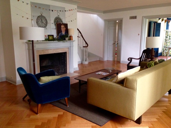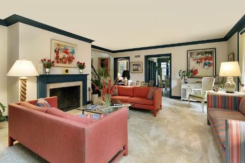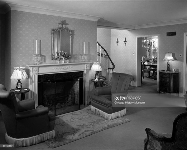 And here’s a little look at our living room through the ages. Interesting to see that the blue trim was NOT original. And isn’t it funny that the chairs and lamps. are pushed up so close to the fireplace in the photo below.