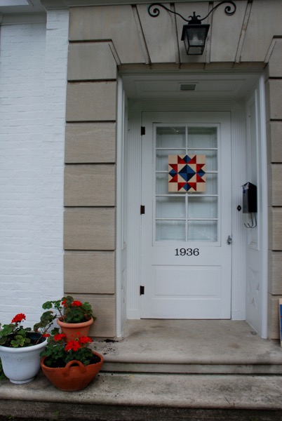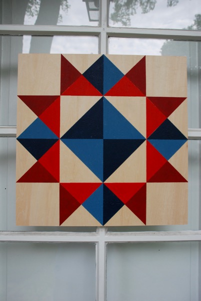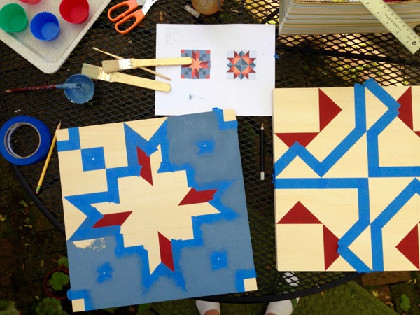 I was feeling patriotic, appropriately, on Memorial Day and I wanted to do some painting. I remember seeing Barn quilts all around Tillamook, Oregon a couple summers ago. I love that they are modern and traditional and Americana all at the same time. Barn quilts are usually around 8 feet by 8 feet. My paintings are smaller – 16″ x 16″, but they are inspired by barn quilts. Now I’ve got one hanging on my door instead of a wreath. They were easy to make with premade wood panels and lots of painters tape.