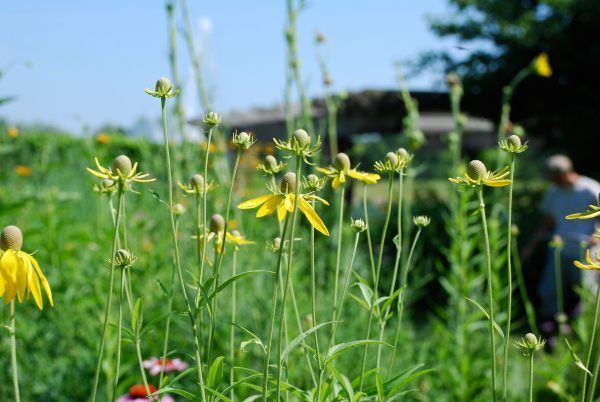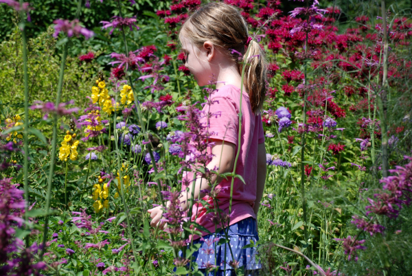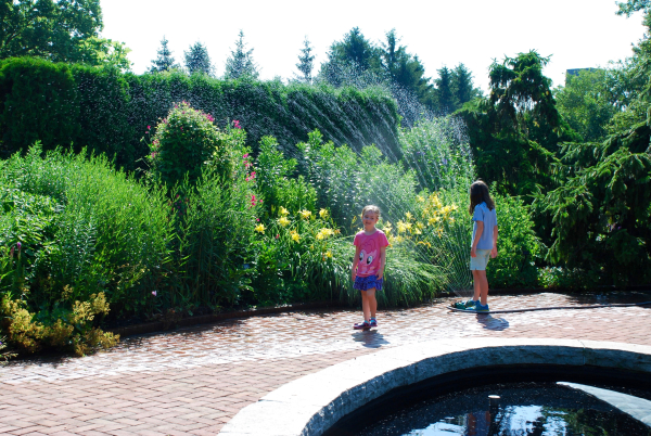 Today I took the girls to the Chicago Botanic Garden. On hot days like this I really notice all the fountains at the garden. Seems like around every bend there is another water feature that the girls are drawn to. It really makes me appreciate the hardscaping and all the different styles of fountains. Plus the gardeners were watering a lot so there were sprinklers to run in.