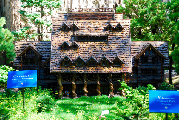 We went to the model train garden. There are little trains snaking all around mini replicas of famous American buildings. It was particularly cool today because we got a preview of our upcoming trip to Yellowstone. See the tiny Old Faithful Inn below. And there is a matching Old Faithful that erupts with water every minute. Fun!