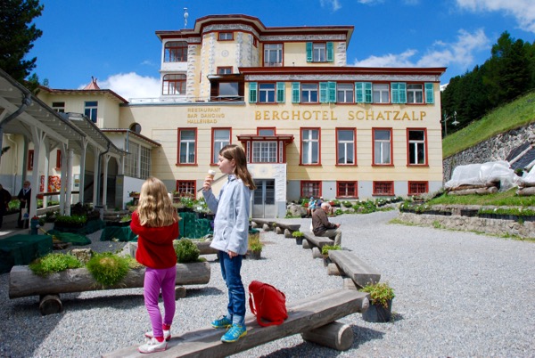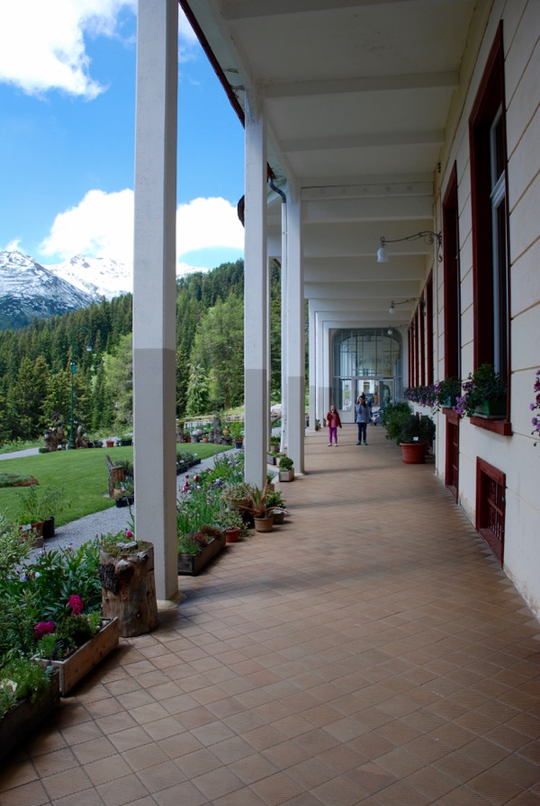 For the first part of our Swiss vacation we stayed in a grand old hotel full of history and slightly shabby character. The Hotel Schatzalp was built in 1900 as the top luxury tuberculosis sanitarium in Europe. It was the inspiration for Thomas Mann’s book Magic Mountain. I read half of Magic Mountain years ago and gave up because I found it boring. Maybe I’ll have to try it again. The hotel was changed from a sanitarium to a hotel around 1950. It has beautiful original art nouveau features and it is perched up on the side of a mountain in Davos. Lovely alpine meadows surround it and beyond that spectacular views of the alps. Our rooms had big covered balconies where the TB patients would sit. I absolutely loved our balcony – so quiet so fresh and such a magnificent view of the valley below. We were lucky to have three perfectly sunny days and I had time to sit out on the wicker lounge chair and romanticize about being a wealthy patient convalescing. On one of our first days it was cold and I was up early because of jet lag; I wrapped up in a robe and a heavy wool blanket out on the balcony. Of course I had to remember (a little) that it was probably not too fun to have tuberculosis. But I can’t imagine a more peaceful, restorative spot than those covered balconies at the Schatzalp. Here are some photos.