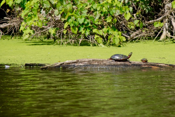 For our Labor Day weekend we visited a couple new places that are close to home. First we went canoing at the Skokie Lagoons. File this under why didn’t we do this sooner. Skokie Lagoons is a nature preserve that has man made ponds winding through it – and it’s only about a five minute drive from our house. We rented a canoe and had a very nice time. Lots and lots of birds live in and around the lagoons. The girls enjoyed the duck weed and other mucky green plants that we paddled through.