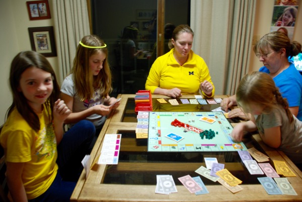 We got out the Monopoly game over Thanksgiving and the girls loved it. First we played at Grandma C’s – Claire was so funny. Whenever she collected money she acted the opposite of humble. She jumped around and gave an evil laugh. Bea started out being the banker and then Claire wanted to be the banker so she paid Bea $500. It was great for getting the girls to practice making change. We had to stop the game when it was bedtime – Claire was the railroad baron raking in all our money so we called her the winner. Then we played at Grandma J’s. It turned out to be an epic game. Grandma kept rolling doubles and somehow four of us ended up in jail at once. Bea was really bad at watching the board and calling it out when someone landed on her property. We got laughing so hard when we made faces at her to try to get her to notice. The game dragged out and Jennifer ended up taking all our money – we actually finished the game! And money-bags Claire ended up being the last one to go bankrupt. So many laughs – so much fun!