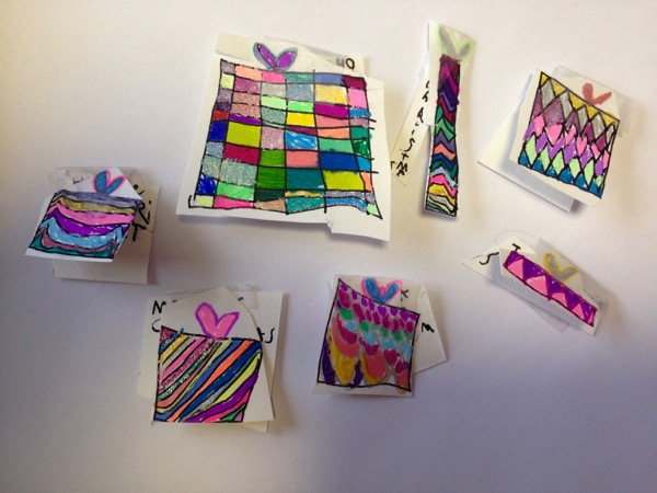 Seems like we do a lot of coloring when the girls gather around Grandma J.’s table. These tiny presents were made by Claire: