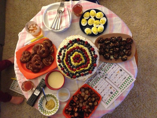 Fruit pizza, deviled eggs, pretzels with cheese sauce, stuffed mushrooms and sausages with mustard. Mmmmm.