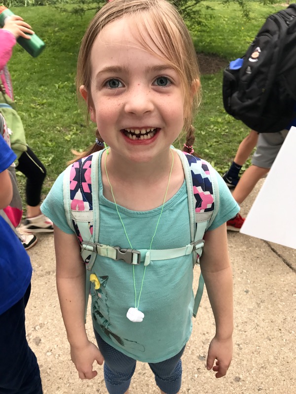 Claire finally lost her first tooth. I keep thinking her teeth have been so slow to come out that they are all going to come out at once. It came out at school so she got a little tooth holder necklace from the school nurse. She was very proud – my funny face.
