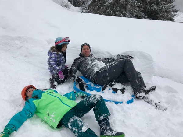 We went to find snow again over the weekend. While it’s gray/brown here at our low elevation we can drive about 40 minutes and find snow that is as deep as Brian’s leg. We went to a ski area called Hoch-Ybrig. We only got out of the car, hiked up a hill and slid back down but the girls laughed a lot and the snow was beautiful.