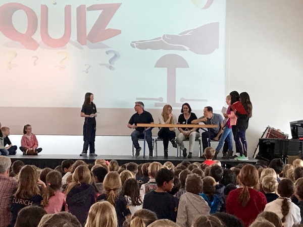 Here’s Bea speaking to her whole school (!) during a school assembly. The student council led this assembly and talked about safety around the school. Then they had a quiz for some teachers. Bea did a great job and there were lots of laughs.