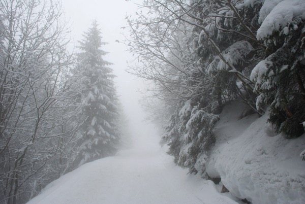 Riding on the gondola was erie – all we could see ahead and behind, above and below were the cables disappearing into the fog. As we went for our walk we could hear other people walking and a few skiers but we couldn’t see them until they were ten feet in front of us. Our eyes felt tired from trying to focus and make out things in the white. It was very strange.