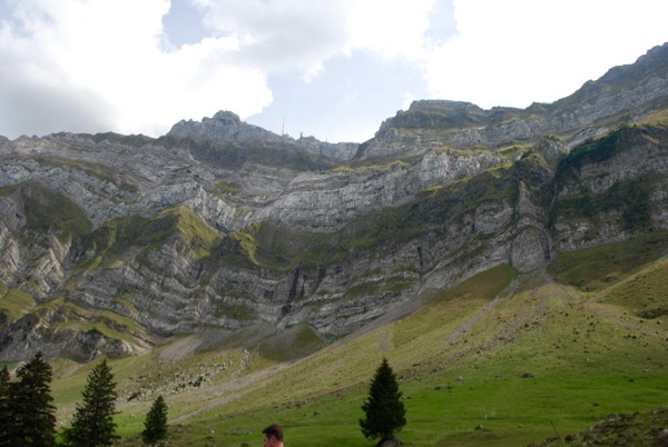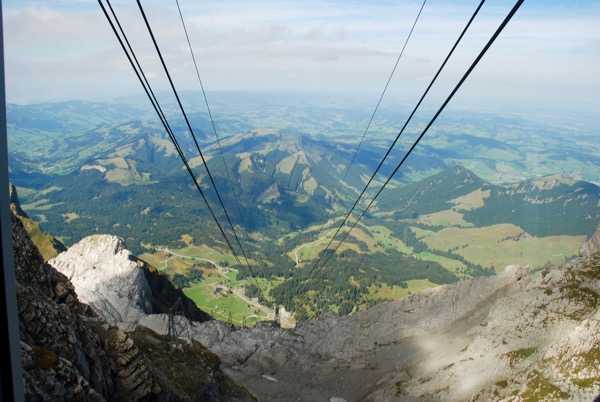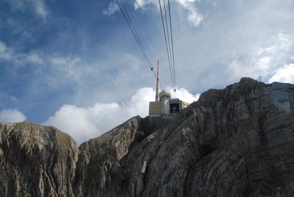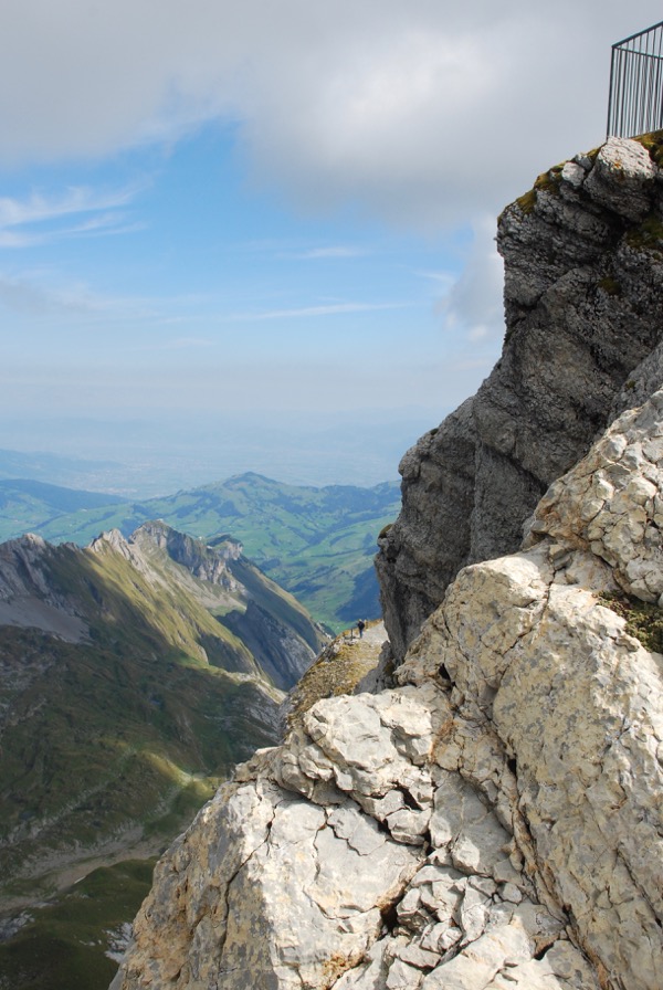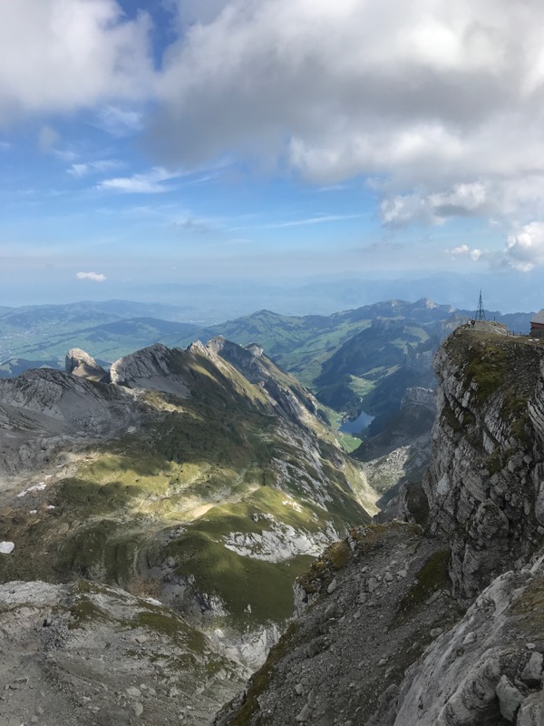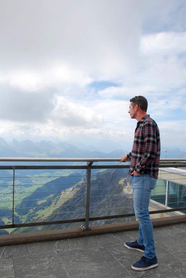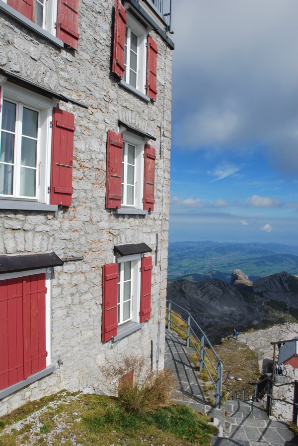 From our apartment you can see a tall mountain far in the distance and on clear days you can just make out that there is a building on top of that tall mountain. Well we finally went to to see it yesterday. Brian had the day off for boys shooting day so we headed out after the girls went to school. The mountain is called Santis and it’s the highest mountain in the Northeast of Switzerland. I promise I did not make Brian go up there – it was a bit of torture for him but it was his idea. It’s not the sort of mountain top that offers tons of hiking. The gondola station is just perched really high on a pile of rock. I think it’s amazing that they can build a big building up there with plumbing and restaurants and everything. It was beautiful and it made me a little dizzy looking out from the platforms at the top.