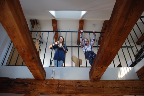 Here are the girls in our hotel room. We stayed at a hotel that started out as a warehouse on a busy harbor in the early 1800s. See the pretty beams? Bea was happy because the mini-bar was free and it was refilled everyday with Fanta!