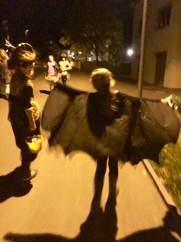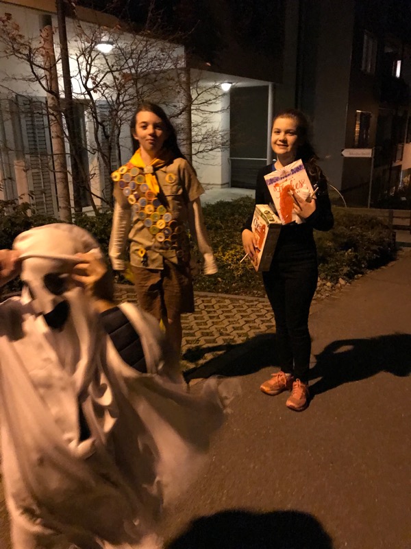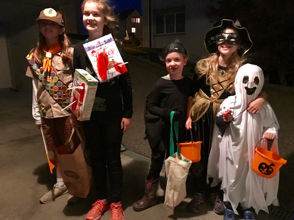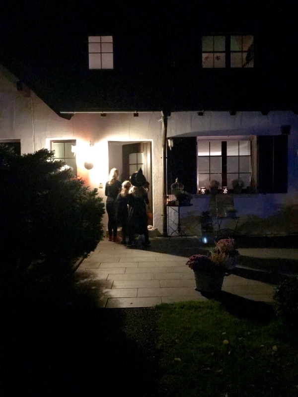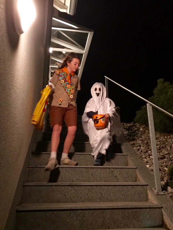 And some Halloween night photos. We finally got to do some real trick or treating in Switzerland. The houses were scattered around Claire’s friend’s town. The people really went all out decorating their doorsteps. It was very blustery and windy – just as it should be on Halloween.