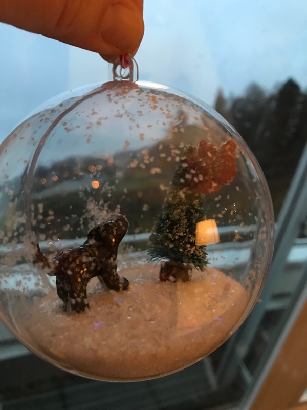 And here’s a snowglobe ornament that Bea made for one of her teachers. She sculpted a little dog and a squirrel in the tree. Hard to get a picture that shows just how cute it is.