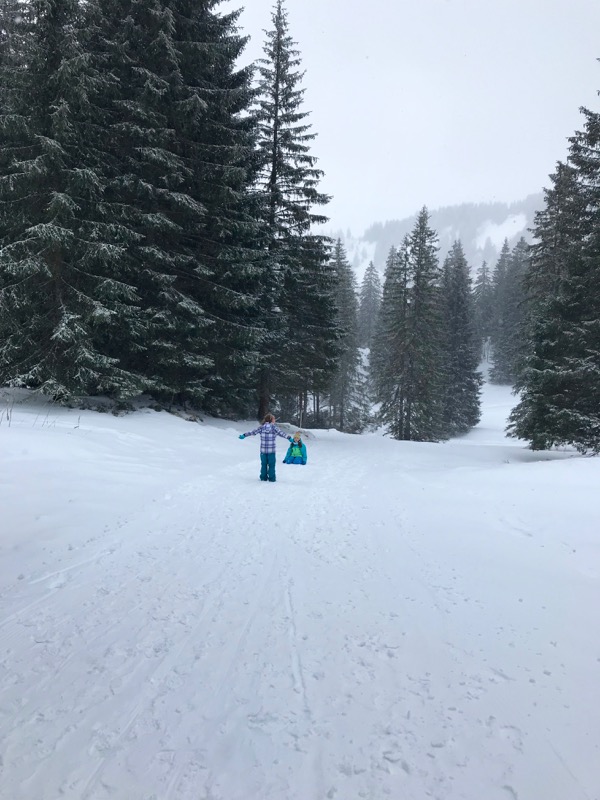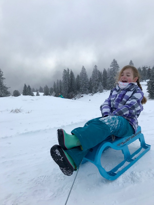 We went to the snow on Brian’s last day of vacation. We went to a ski resort that’s close to us called Flumserberg. We had just a little walk – hopping on the sleds whenever the trail went downhill. The wind was really blowing hard and we got a little chilly so we had lunch and went home. Bea is such a snow lover these days! She really would be happy to live in a snowy place all year round. It was nice to see some real snow for the first time this winter. And then last night we got an inch or two of snow in our town. Since our windows are slanted the snow tends to stick to them and we feel like we live in a giant igloo.