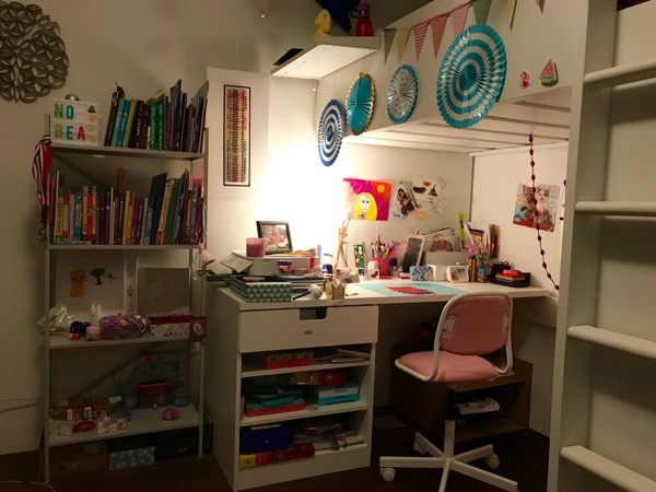 Here’s Claire’s desk after we cleaned up. She carefully arranges her one-thousand trinkets. Oh my!