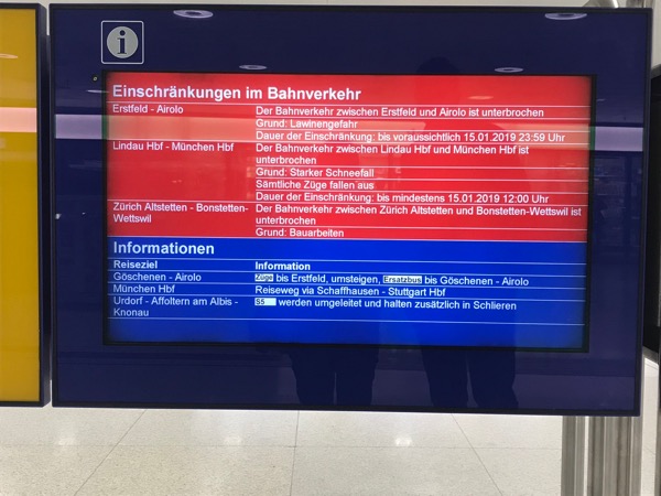 We noticed some trains were cancelled in parts of Switzerland because of avalanches (Lawinengefahr) and heavy snow. I think that’s very unusual.