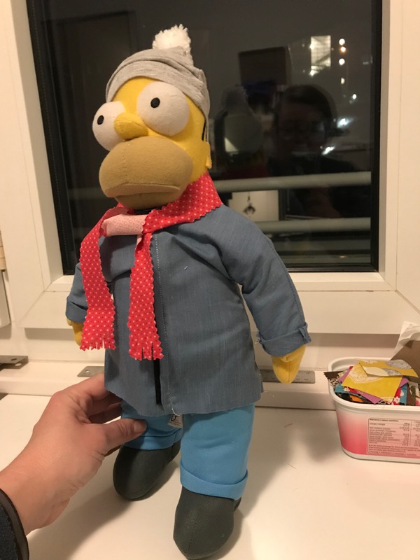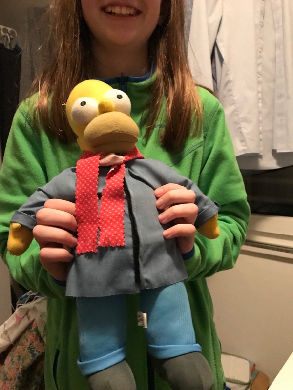 Homer Simpson had to have some new winter clothes last night. Bea and I whipped up this dapper outfit – a coat and scarf and hat. I always assumed, with daughters, I would be sewing doll clothes but who would have guessed I’d be helping my daughter sew Homer Simpson clothes.