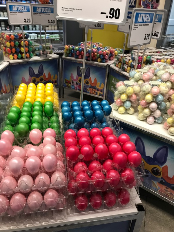 Aunt Donna – the eggs in the top picture are hard boiled. They call them picnic eggs. They sell them all the time and are usually colorful. But they are especially pretty and shiny at Easter time. Around Swiss national day they sell red ones with Swiss crosses. Brian eats one most days for breakfast.
