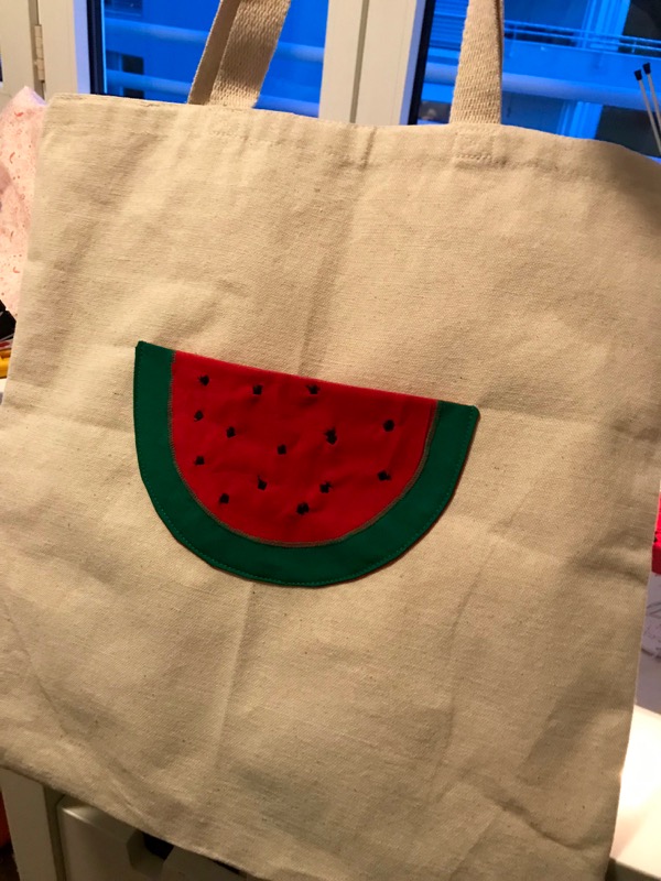 Claire wanted to make a watermelon bag – so we added a watermelon pocket to a canvas bag that we had around.