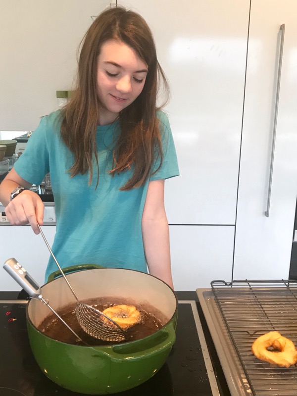 Ok we’re friends with baking again. Bea and I made crullers on Saturday morning. The nice thing is that they are like doughnuts but they are made with an eggy dough that isn’t yeasted and so you don’t have to wait for it tor rise. Bea was the fry master and she did a great job. The recipe was from the Zingerman’s Bakehouse book. Yum – we will be making these again!