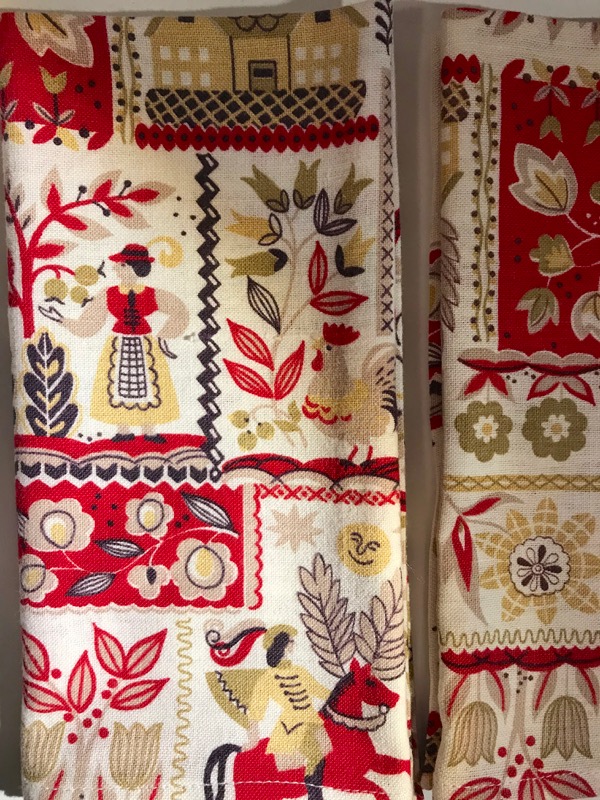 Jennifer gave me some old fabric for Christmas and I love it. It has chickens and horses and houses and funny folk people and smiling sunshines and sweet flowers. I’m making a new set of napkins so I can see the pattern all the time.