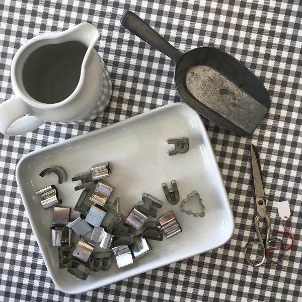 Today I outdid myself in the brocki shopping department. I visited five brocki’s! I saw lots of treasures but I showed restraint and only came home with a few things. I got a set of alphabet cookie cutters, a pretty pitcher that matches a bigger one I already own, a small baking dish, some nice scissors and a sturdy scoop. That’s a lot of happiness and entertainment for only about 25 francs.