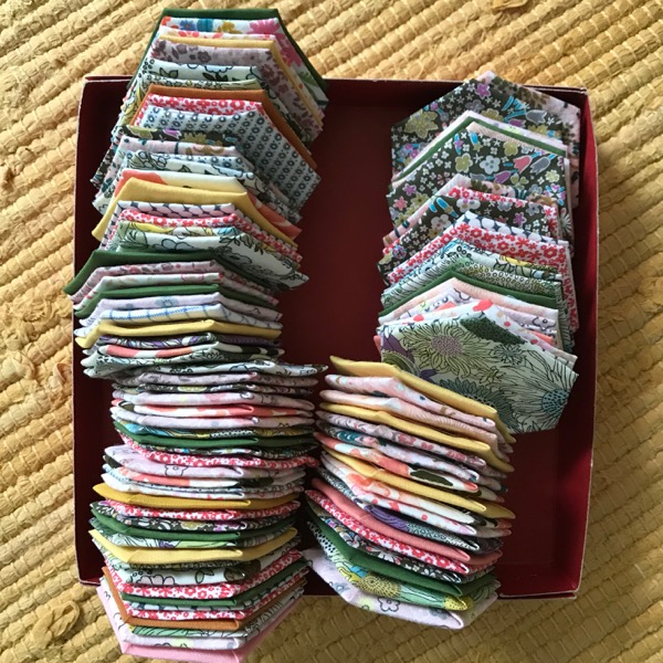 I’m still plugging away at my hexagon quilt – here are 100 more hexagons ready to be sewn together.