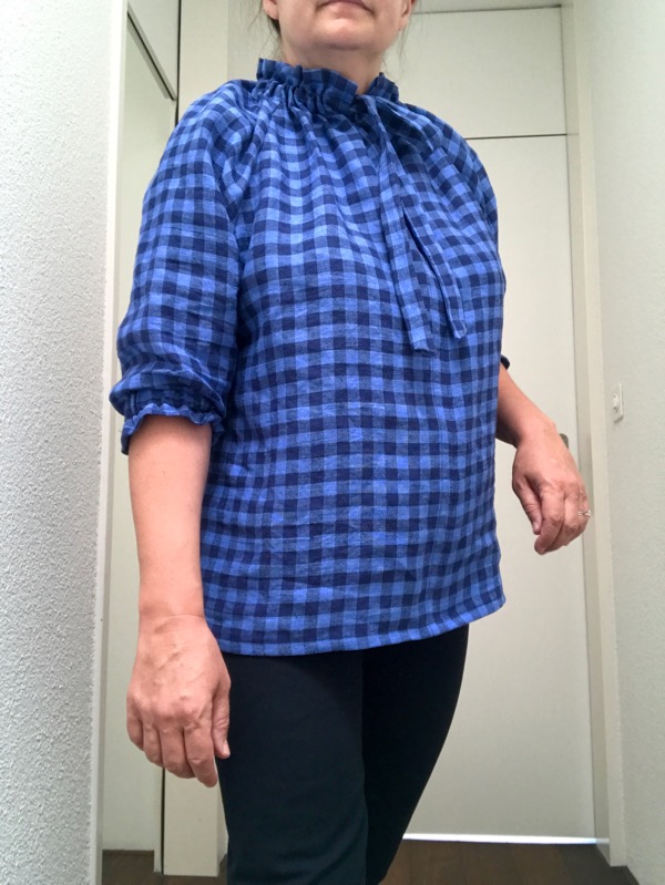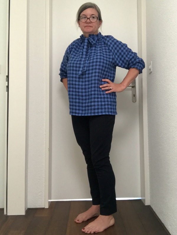 In other news I came across some pretty linen gingham and so I had to make a shirt. Some quality time with my sewing machine before it gets packed up in our shipment. Sniff. It’s the Wilder Gown pattern from Friday Pattern Company again. Such an easy pattern – just three pieces plus the ties. I should brush my hair…