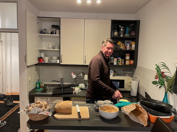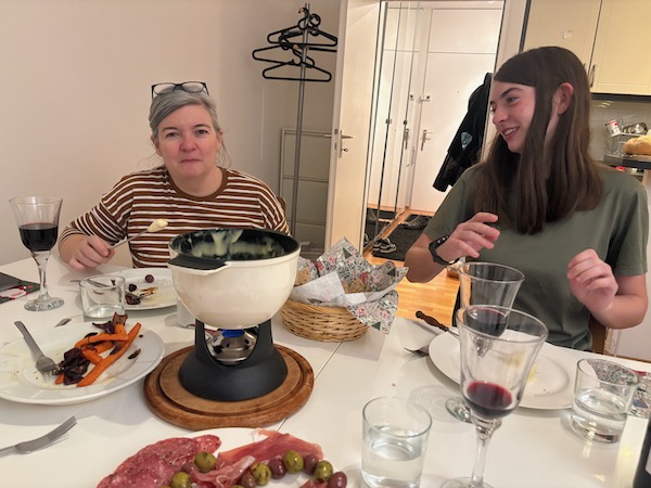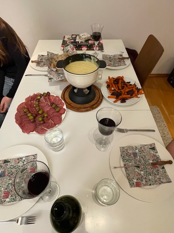 Brian and I found a fondue pot when we did our brocki shopping in Zurich – so we lugged it and two types of fondue to Munich. The day before, we all went to the grocery store and spent way too much time and got annoyed with each other while buying the extra ingredients for our feast.