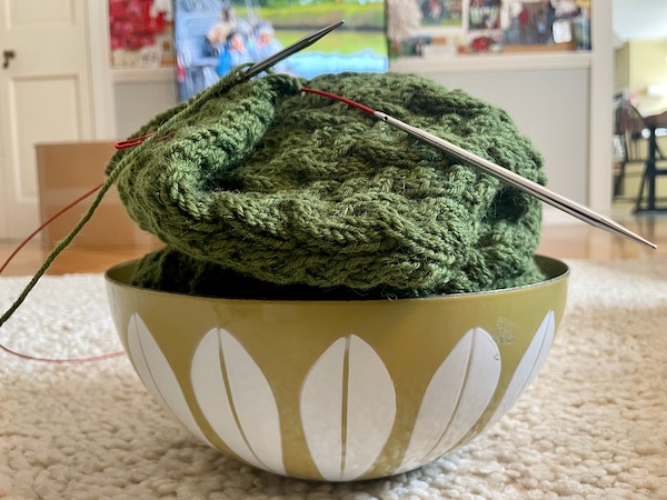 I put my sweater in a bowl when I’m working on the sleeve. It’s easier to swivel the whole bowl around as you rotate the sleeve instead of picking up the whole project and turning it all the time. And, bonus, I like how my Catherine Holm bowl looks with the sweater.