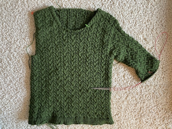 In other news I am working on a couple projects. First my cable knit sweater – it seems to be taking forever but I made more progress this week. The sleeves on this pattern had shaping at the top that I’ve never done before. It was a challenge but I’ve tried it on and I think it’s going to be good.